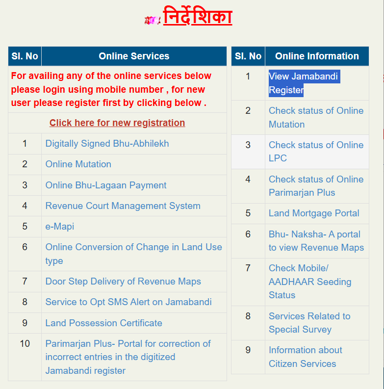 ऑफिसियल वेबसाइट के होम पेज पर निर्देशिका की स्लाइड दिखाई देगी उसमें View Jamabandi Register के विकल्प पर क्लिक करना है |